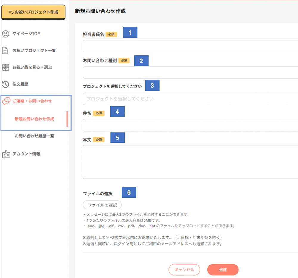 ・新規お問い合わせ作成(フォーム)からお問い合わせを入力して送信します。