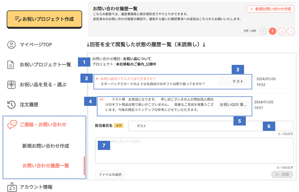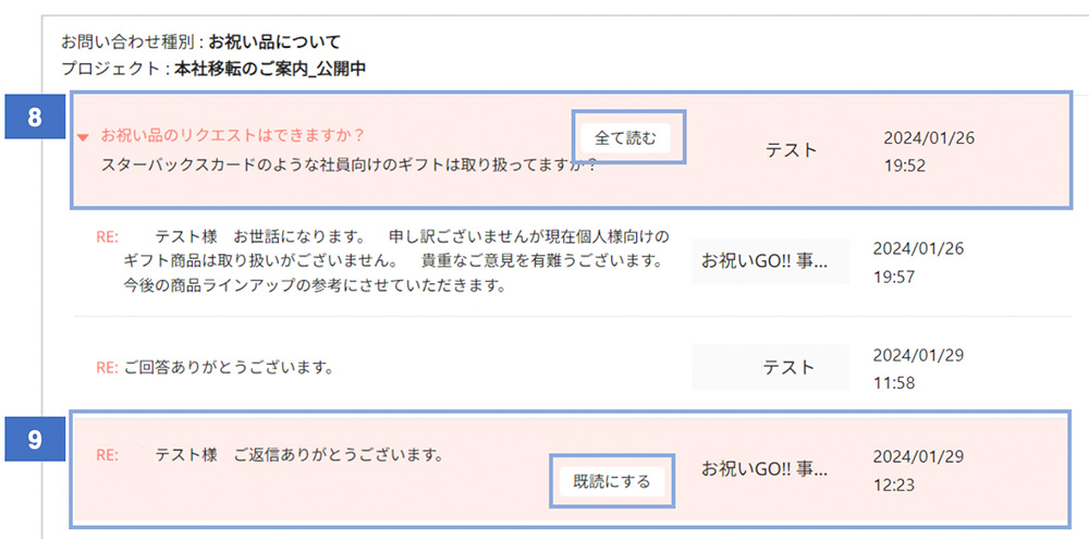 8:新しく回答や案内が届くと色付きの背景で表示されます。